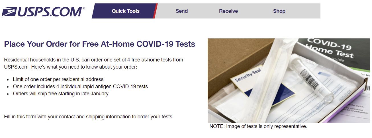 Residential households in the U.S. can order one set of 4 free at-home tests from USPS.com. Here’s what you need to know about your order: