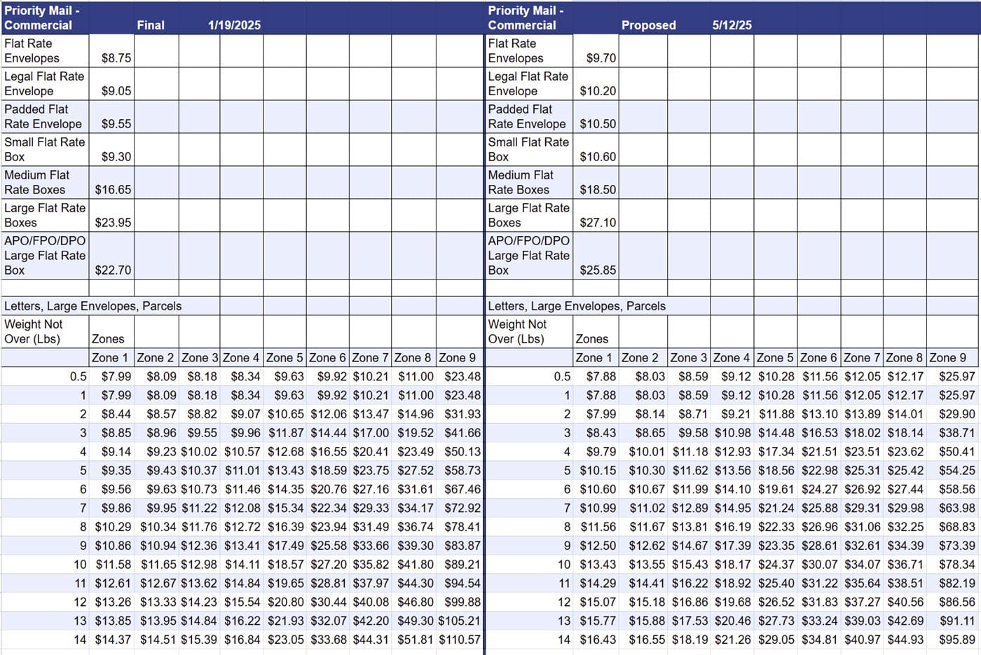 Value Added Resource has compiled exclusive side by side comparison excerpts using data provided by USPS for informational purposes - check with your post office to confirm rates.