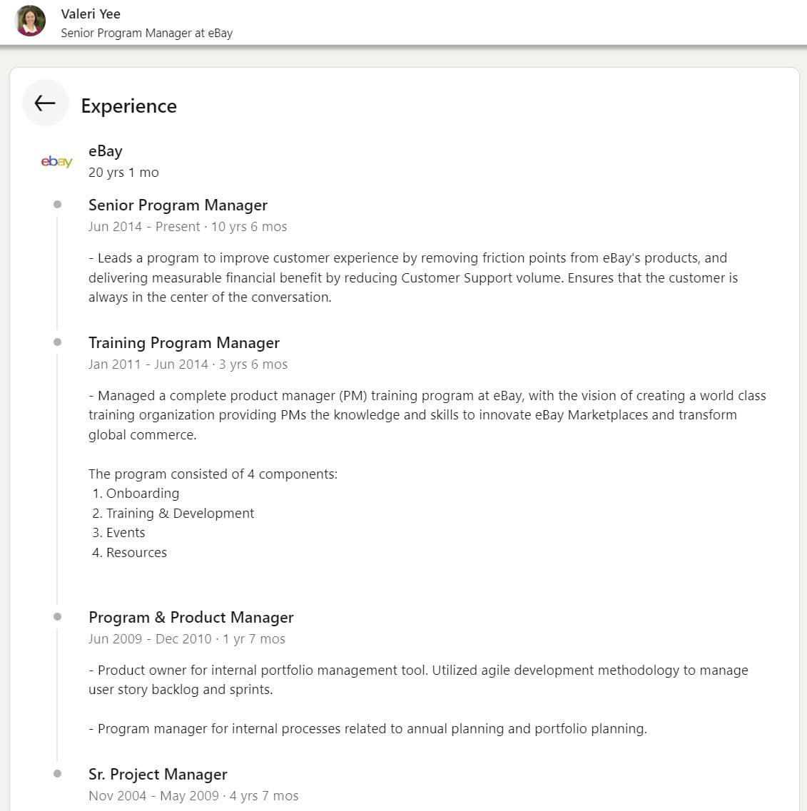 While her LinkedIn profile has not yet been updated to indicate a promotion or title change, it does show her 20 year history at eBay with extensive experience that would absolutely be an asset in this position.