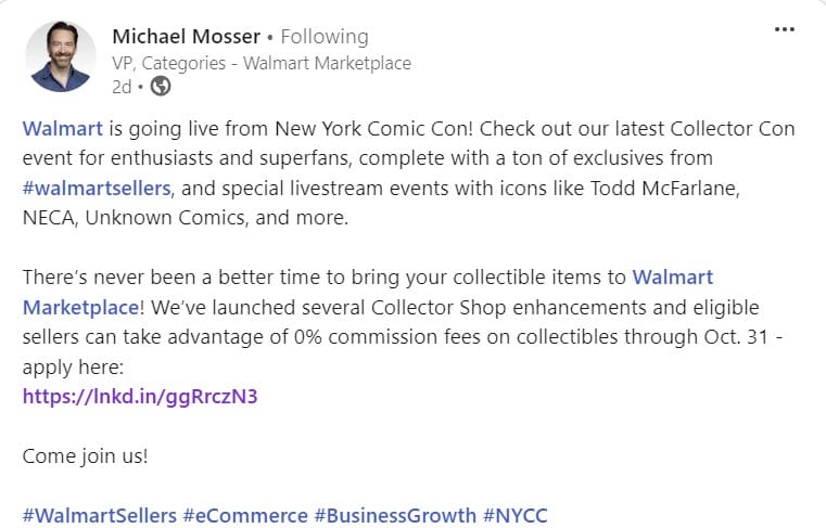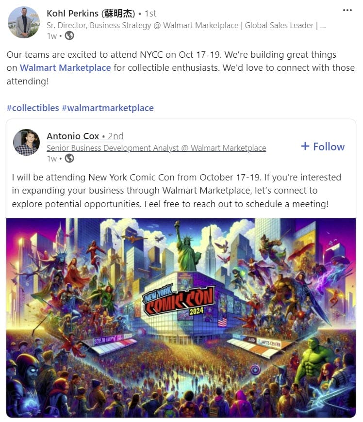 Senior Director Business Strategy Walmart Marketplace, Kohl Perkins, also took to LinkedIn to connect with NYCC attendees, sharing a post from Senior Business Development Analyst, Antonio Cox.