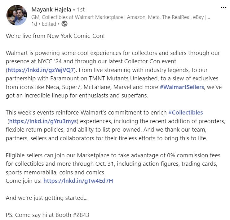 GM Collectibles, Mayank Hajela, invited NYCC attendees to stop by the Walmart booth to hear more about the company's commitment to the Collectibles category with a special call out to that 0% selling fee promotion.