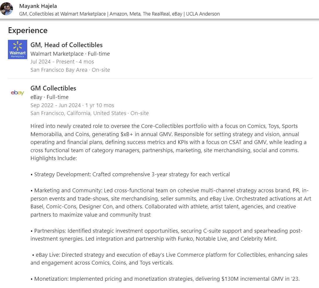 He was also the point man for the eBay Vault (since sold to PSA/Collectors Universe as part of eBay's deal to acquire Goldin Auctions) and eBay Live livestream shopping initiatives.