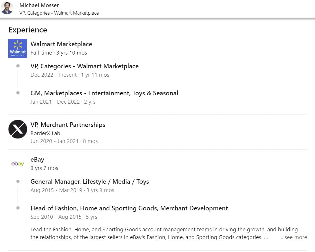 Mosser was GM Lifestyle/Media/Toys at eBay from 2015 - 2019 with a stop at Borderx Lab before joining Walmart in 2021.