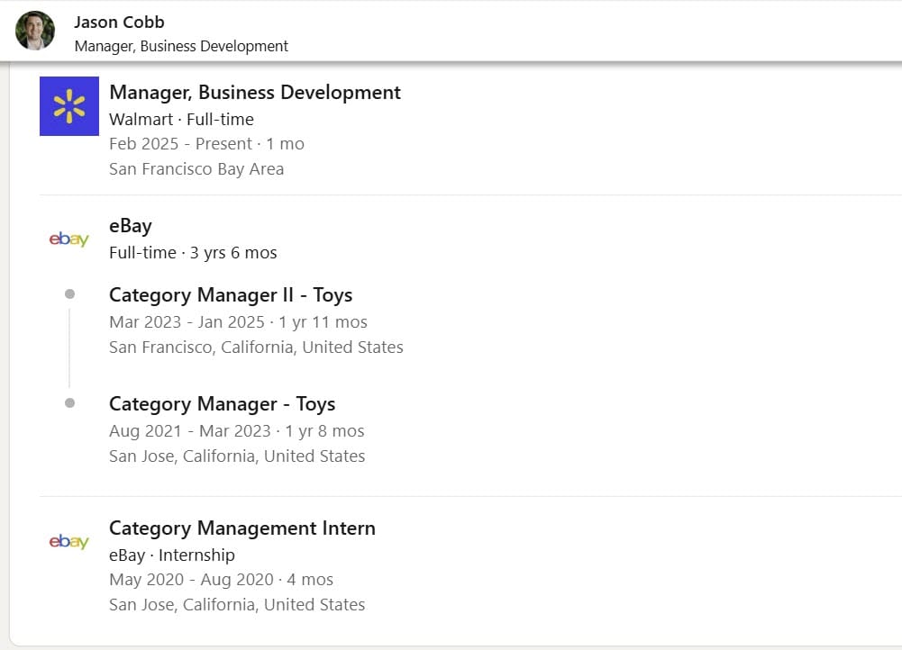 Another ex-eBayer has joined Walmart Marketplaces collectibles and toys team with ex-Toys Category Manager Jason Cobb taking on a Business Development Manager role at Walmart.