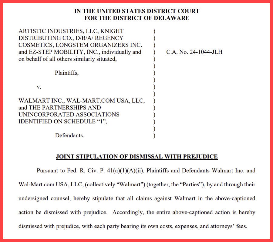 Plaintiffs Artistic Industries LLC, Knight Distributing Co, Longstem Organizers Inc and EZ-Step Mobility Inc and Walmart have filed a joint stipulation of dismissal, ending this lawsuit with both sides bearing their own costs, expenses, and attorneys’ fees.