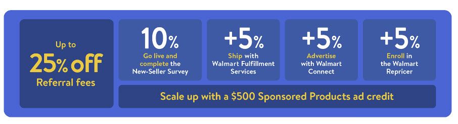 New sellers will get a 10% reduction when they complete sign up and the new seller survey, plus additional fee discounts for opting in to Walmart Fulfillment Services, Walmart Connect advertising, and Walmart Repricer