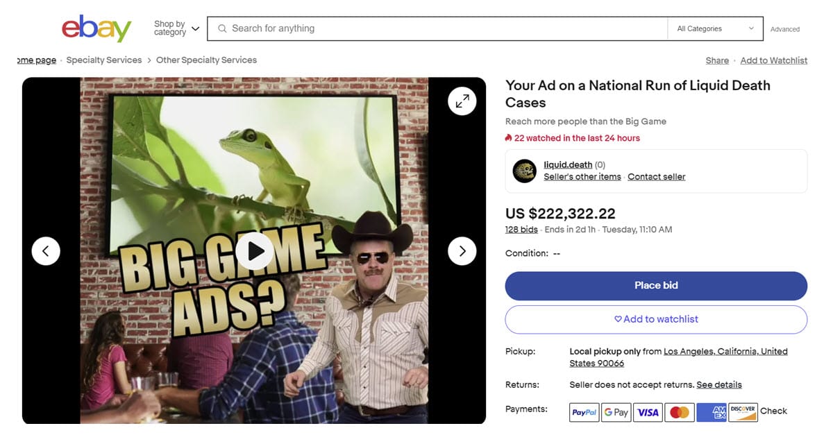 eBay may not be running a Super Bowl ad today, but they'll still be getting some attention thanks to a cheeky anti-Big Game ad stunt by canned water brand Liquid Death, auctioning off ad space on their packaging.