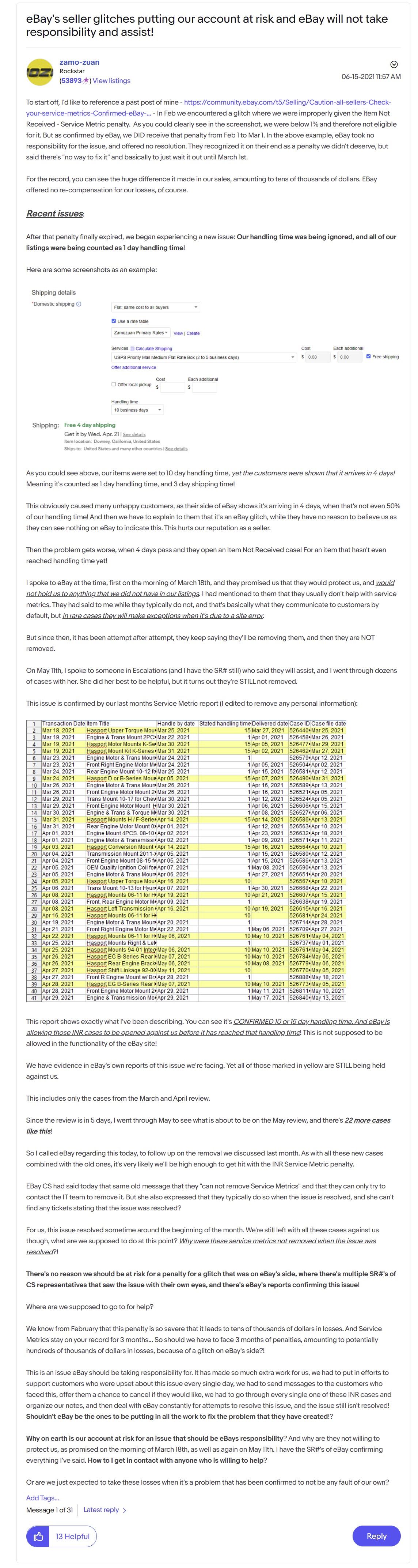 One seller brought a serious technical issue to light in March when eBay's changes to the "Fast & Free" shipping badge seemed to have broken estimated delivery times and caused eBay to completely ignore their 10-15 day handling time.
