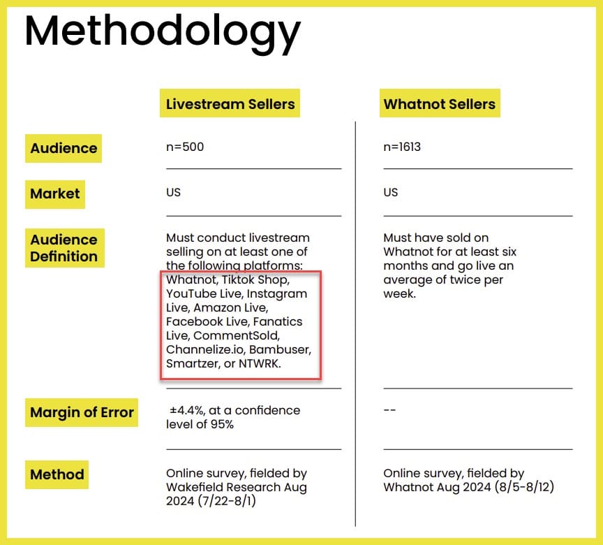 The section about methodology lists the other platforms sellers in the survey are using - Tiktok Shop, YouTube Live, Instagram Live, Amazon Live, Facebook Live, Fanatics Live, CommentSold, Channelize.io, Bambuser, Smartzer, and NTWRK - with eBay Live being a notable and telling omission.