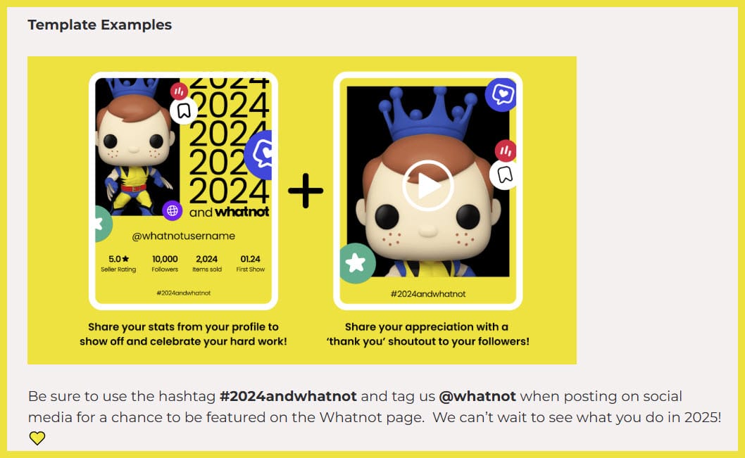 And to close out the year in review, Whatnot is providing customizable templates for sellers to use on social media to showcase their channels and stats.
