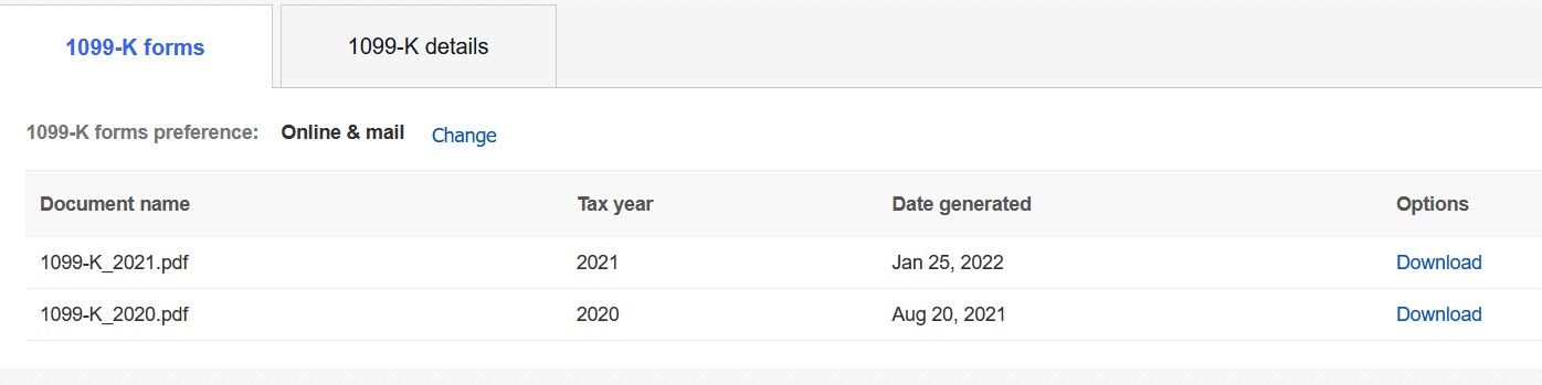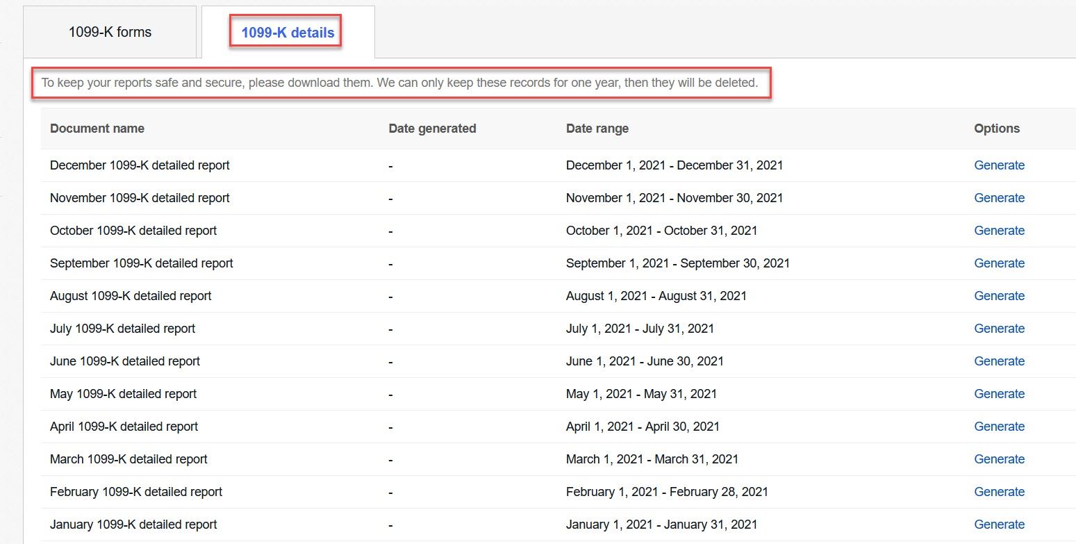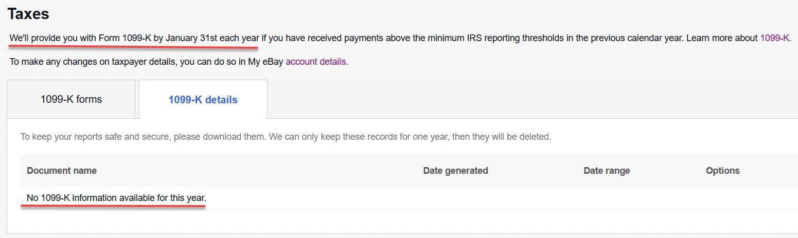 eBay also provides detailed 1099-K reports by month, which should be downloaded an kept for your records as eBay will only retain them for 1 year.